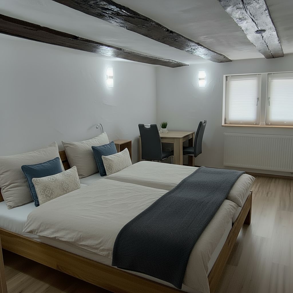 Doppelzimmer mit Durchgang zu Zimmer 4 – ideal für Familien. Eigenes Bad mit bodenebener Dusche.